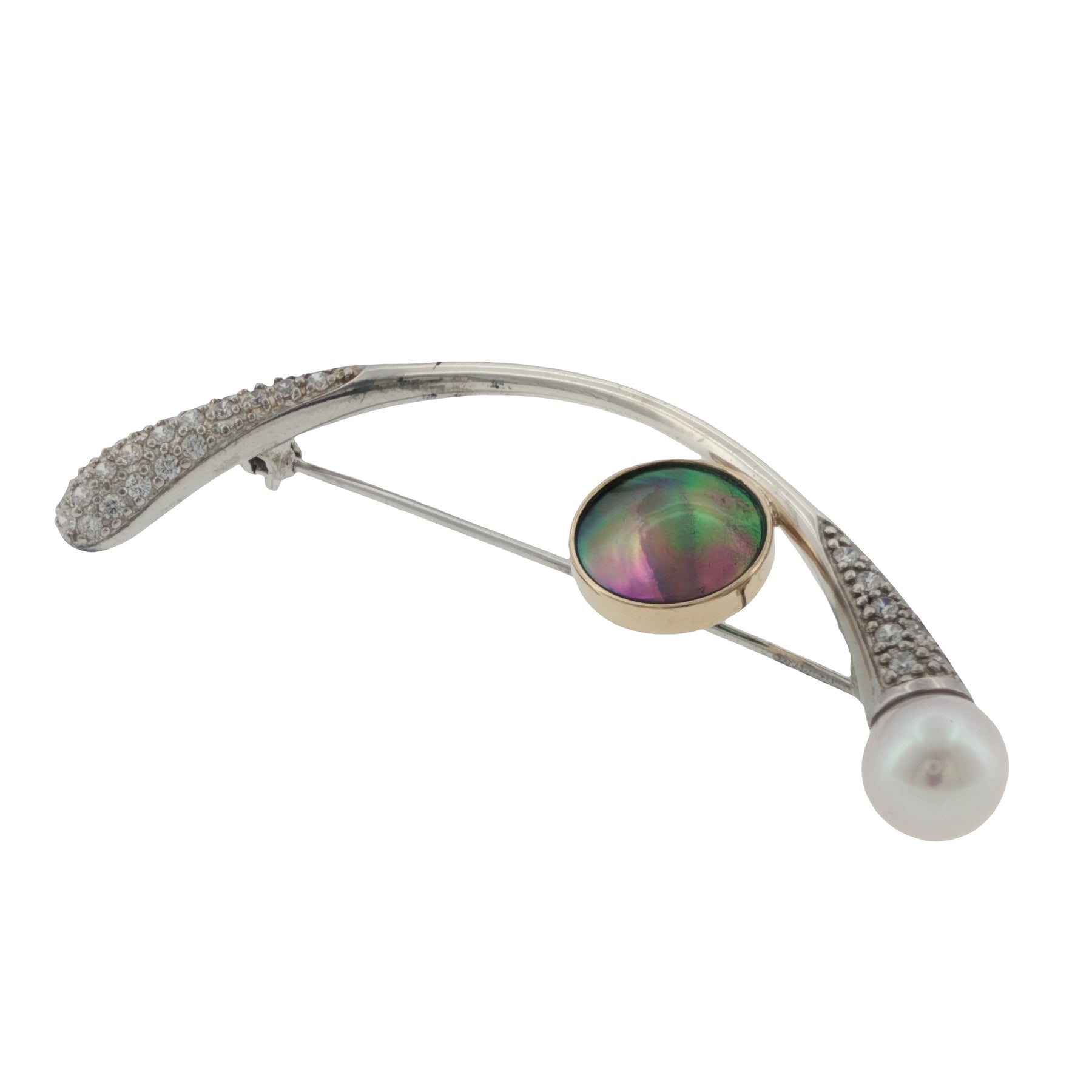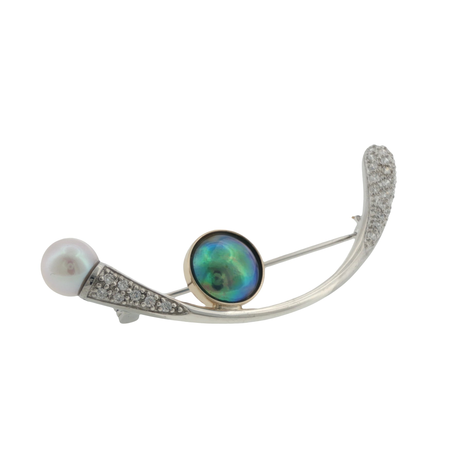 The refined 9ct gold and sterling silver setting with cubic zirconia accents is intentionally understated, designed to highlight the pearl's natural beauty without distraction. This brooch reflects a considered approach to pearl jewellery, one that values patience, precision, and longevity.