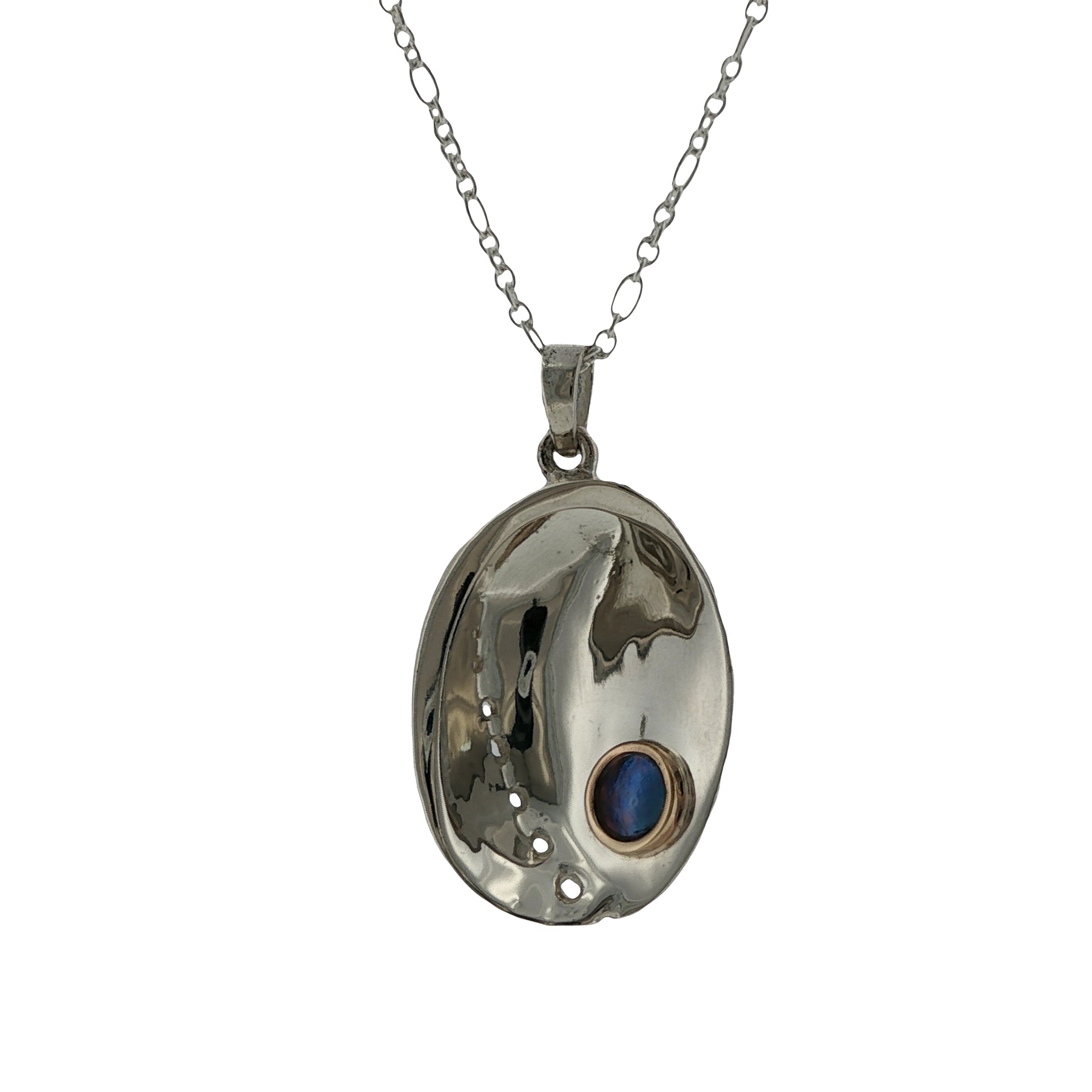 A two-tone 9ct gold and sterling silver pāua pearl necklace featuring a rare Arapawa blue pearl grown on Arapaoa Island in New Zealand's Marlborough Sounds. The Paua Shell design references the natural form of the pāua shell itself, while allowing the natural iridescence of one of the world's most uncommon pearls to take centre stage.