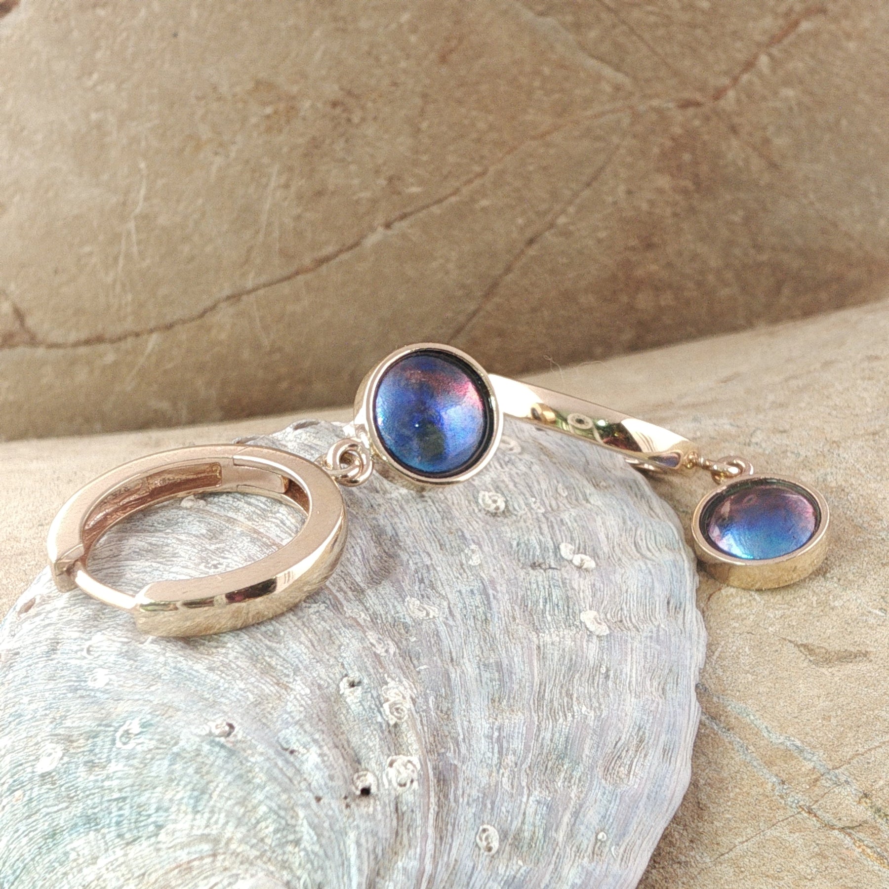 Now suspended from simple, elegant 9ct Gold Udana Earrings, these blue pearl earrings become something timeless, catching the light, shifting in colour, and carrying the quiet beauty of Arapaoa Island with you wherever you go.