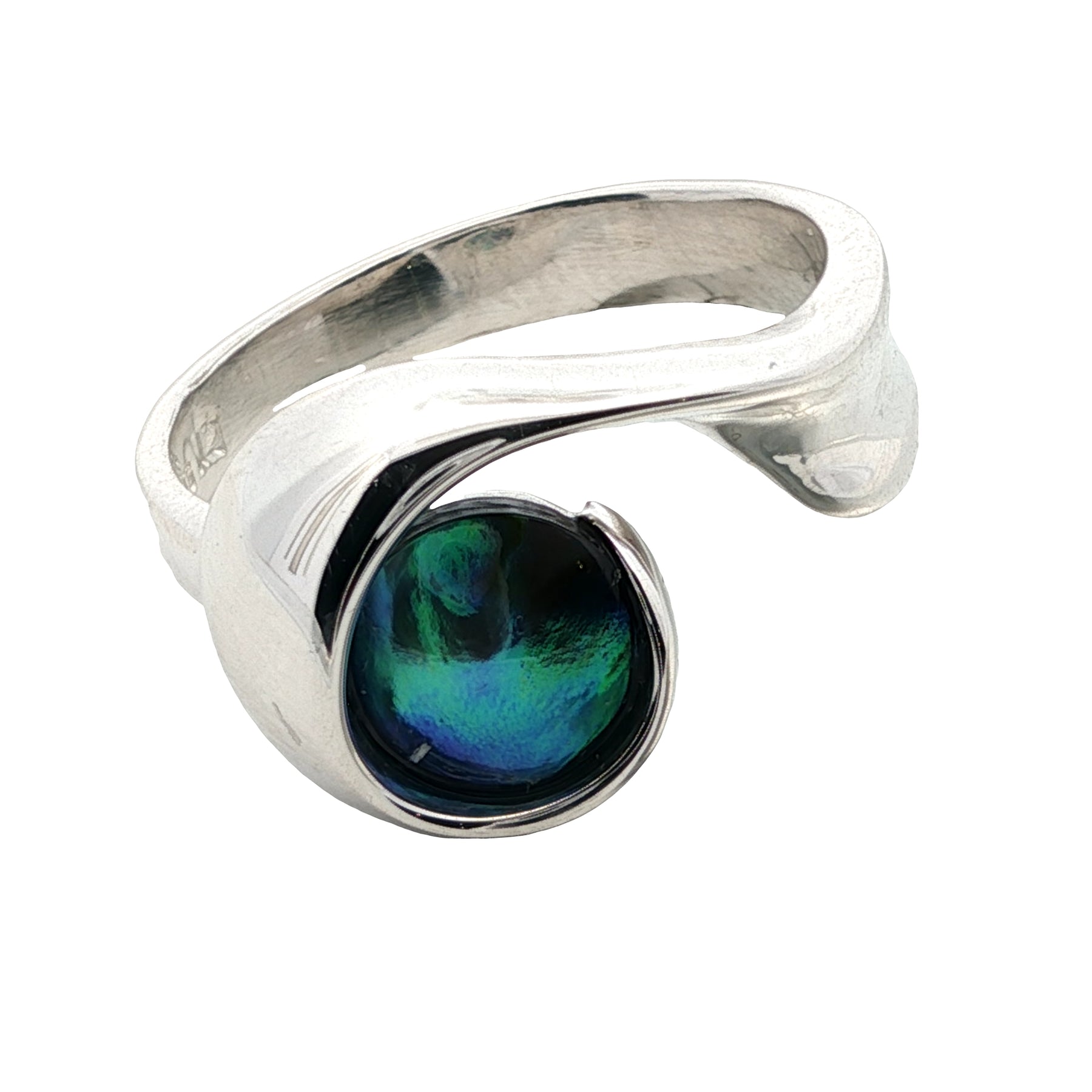 Each paua pearl is unique; no two share the same colour pattern or iridescence. This handcrafted pearl ring features a hand-selected pearl displaying rich ocean blues, coastal greens, and flashes of rainbow overtones that dance as you move. Grown with patient precision over eight years, each pearl's beauty is unrepeatable, shaped by time, nacre, and the paua's natural response to our carefully placed inserts.