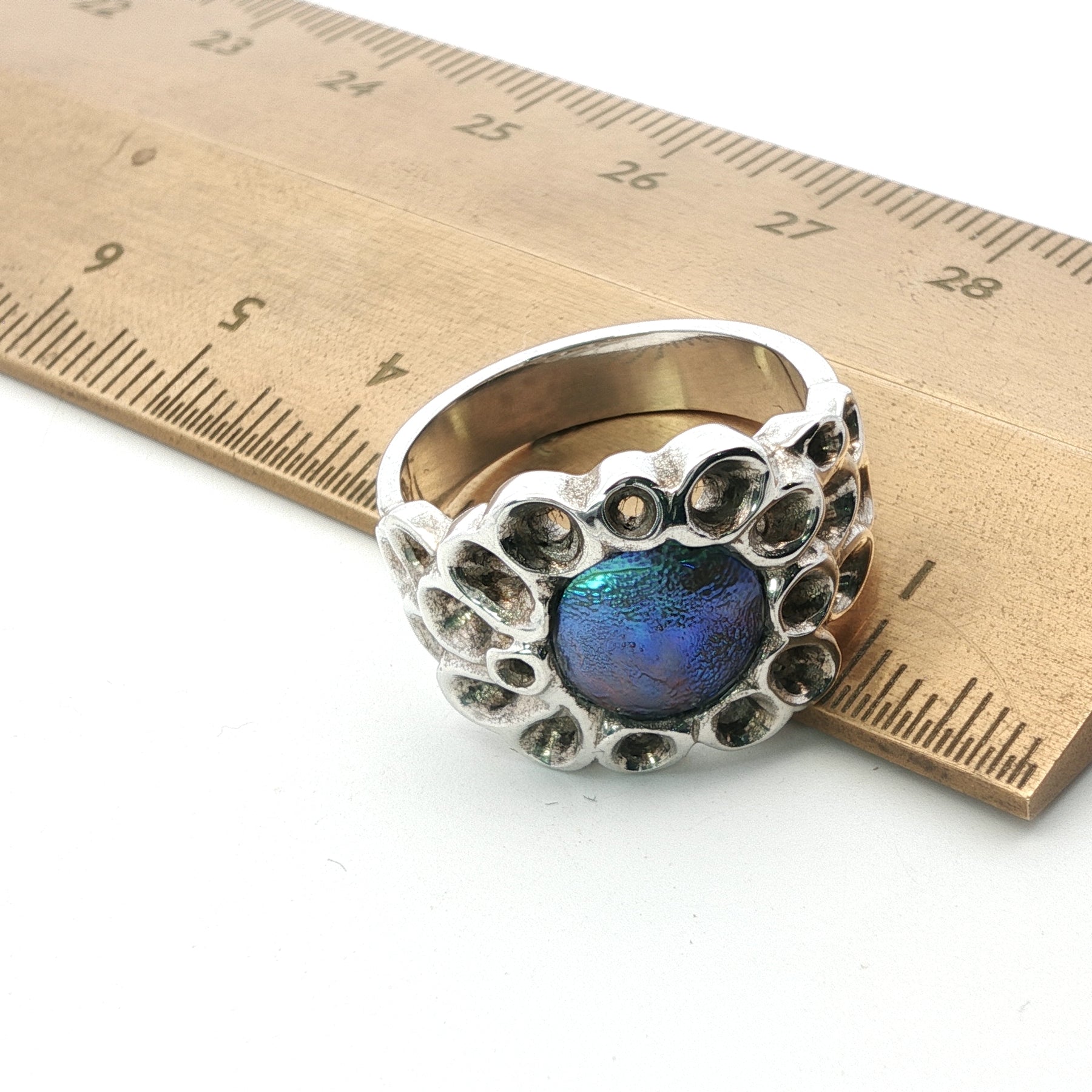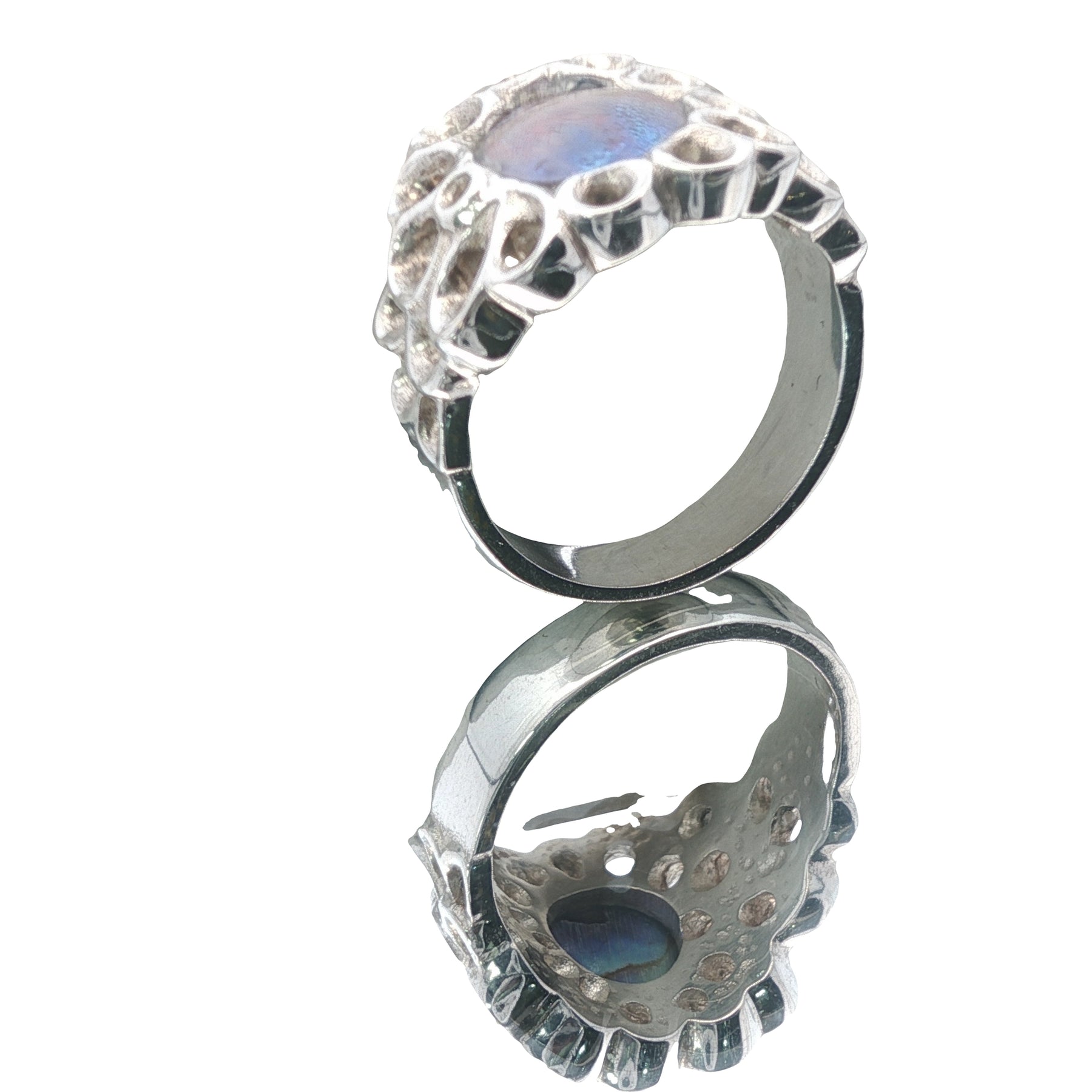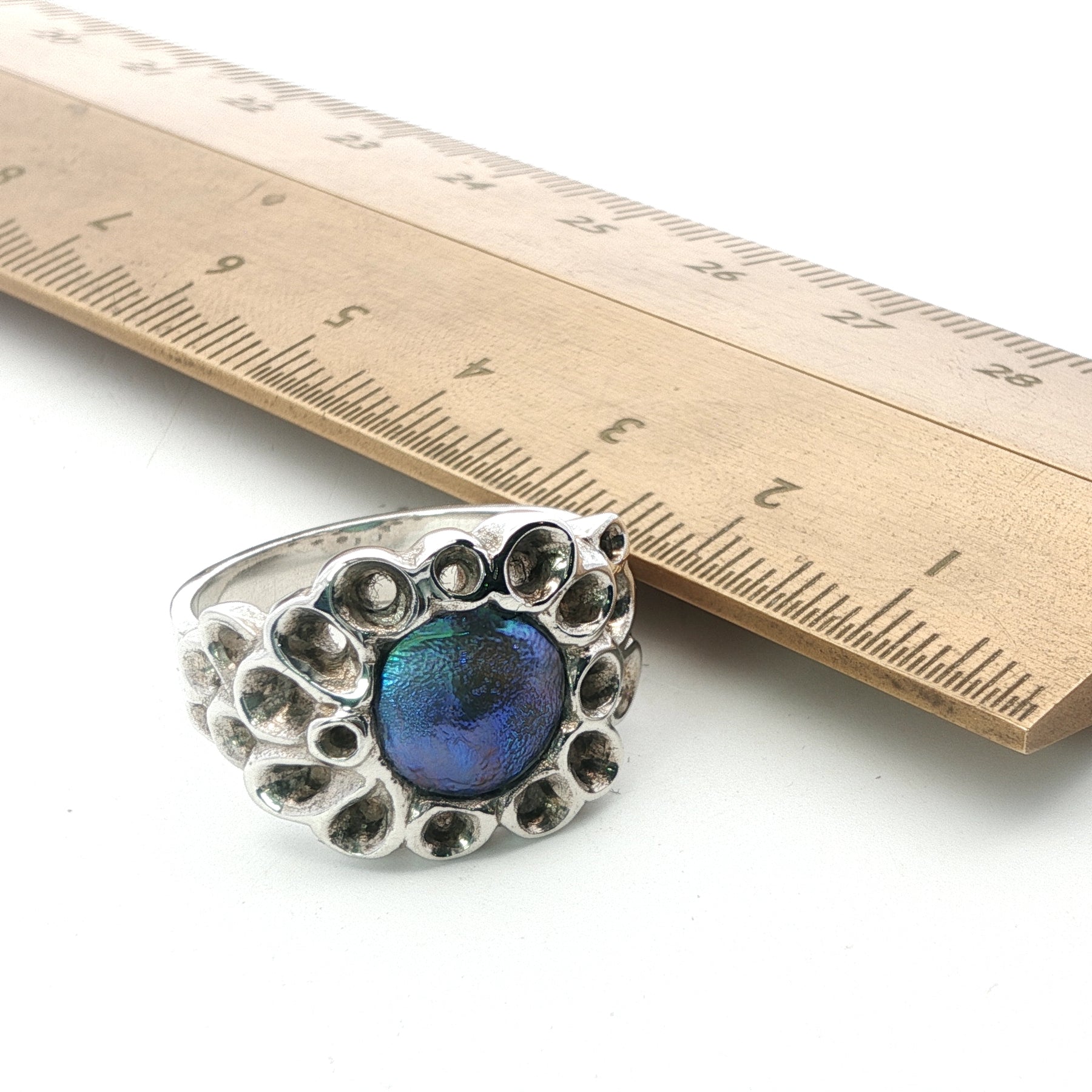 Each paua pearl is unique; no two share the same colour pattern or iridescence. This handcrafted pearl ring features a hand-selected pearl displaying rich ocean blues, coastal greens, and flashes of rainbow overtones that dance as you move. Grown with patient precision over eight years, each pearl's beauty is unrepeatable, shaped by time, nacre, and the paua's natural response to our carefully placed inserts.