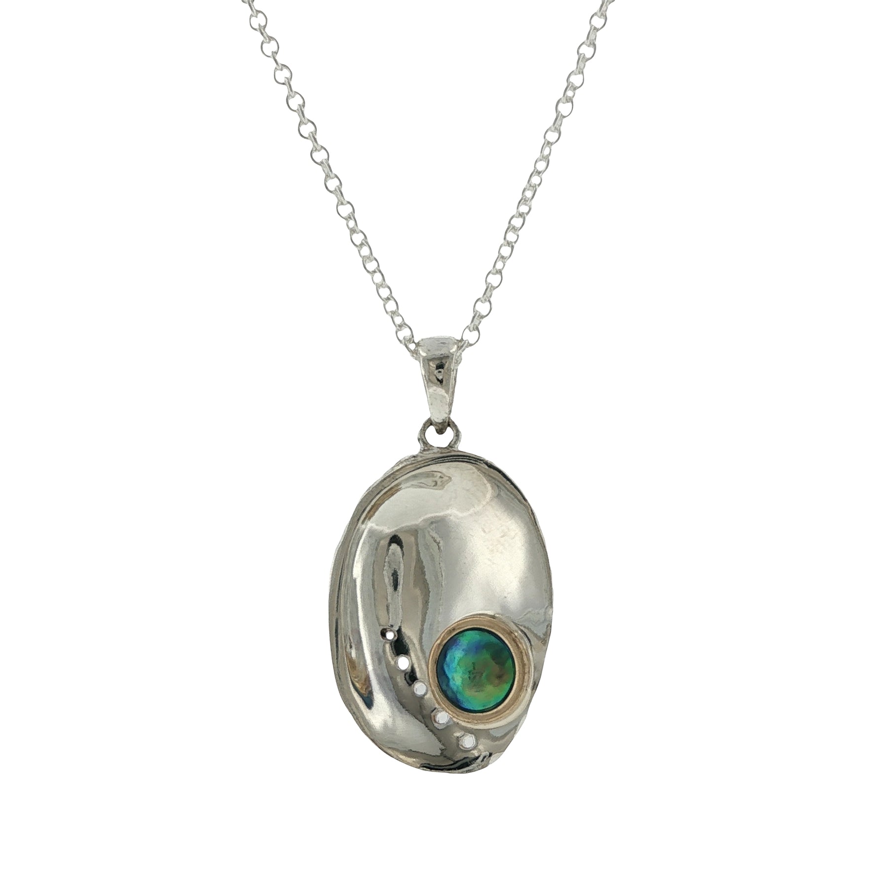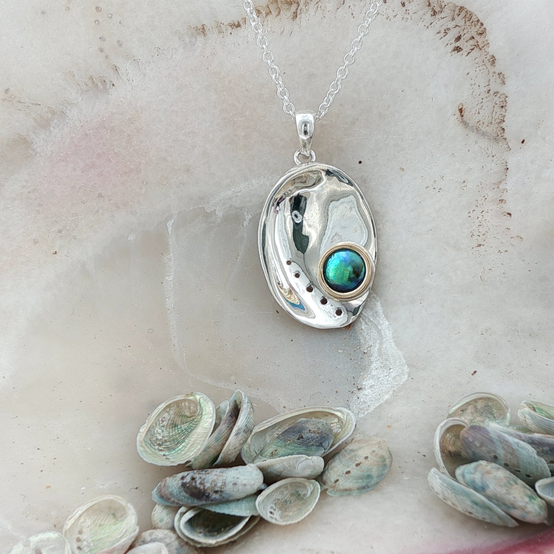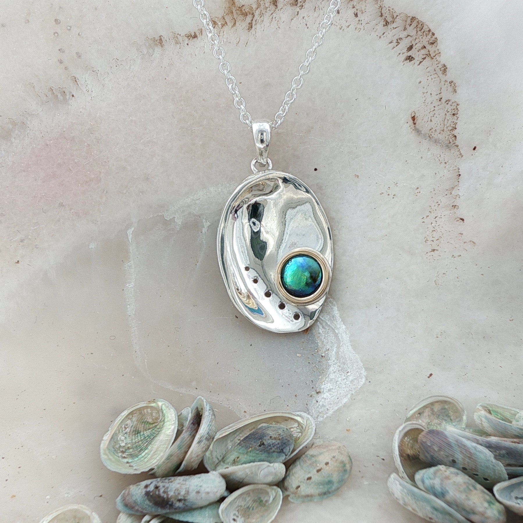 A sterling silver & 9ct yellow gold pāua pearl necklace featuring a rare Arapawa blue pearl grown on Arapaoa Island in New Zealand's Marlborough Sounds. Selected as the birthpearl for May, this piece offers a meaningful New Zealand interpretation of the traditional pearl birthstone.